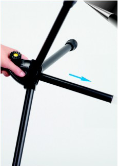 3.往下輕推斜桿架,調整適當長度距離,定位後適當力道鎖緊斜桿固定帽和轉角右側固定枉。
